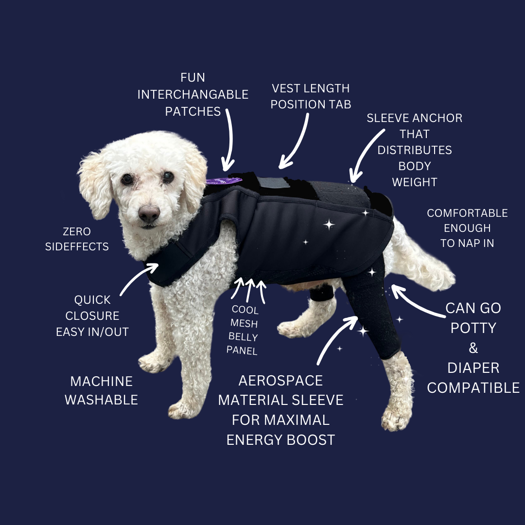 - Additional Aerospace Materials that Enhance the Effect of Natural Motion: For 3-legged motion, our Dynamic Mobility Brace incorporates advanced, bio-responsive materials similar to those utilized in US made space suits. The material is compacted into micro-diameter springs that, upon activation, engage dynamically with the dog’s movement. This combination of durability, breathability, lightweight design, and responsive compression, optimally supports musculoskeletal function in varying gravitational environments, making it exceptionally suited for high-performance use on Earth.